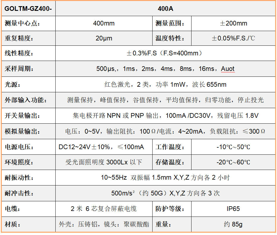 GOLTM-GZ400-400A型紧紧缴光测距仪可以用于高控制精度、高频率的精确测量产品工件位移、长宽、长度及长度差,装备调测详细,数码设备呈现可以说 连续或可以说 连续,提供摹拟量输出及电源开关量输出。𒁃● 激(ji)光三(san)角形丈(zhang)量(lℱiang)道理,高(gao)(gao)精度、高(gao)(gao)速(su)率(lv)、高(gao)(gao)活(huo)络度丈(zhang)量(liang)细小位移
